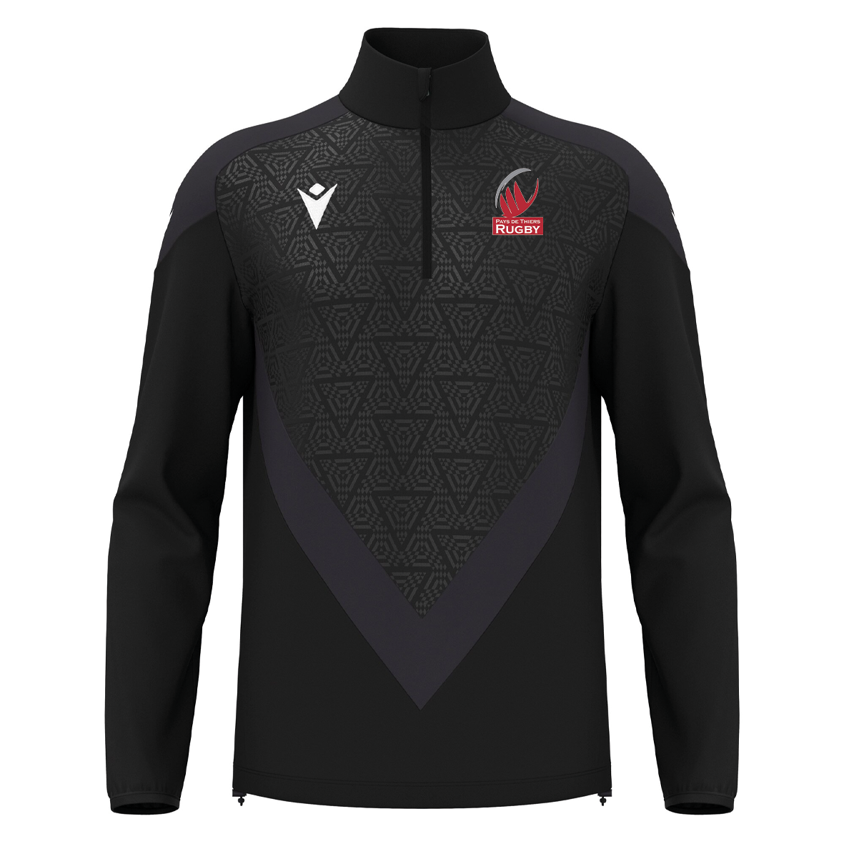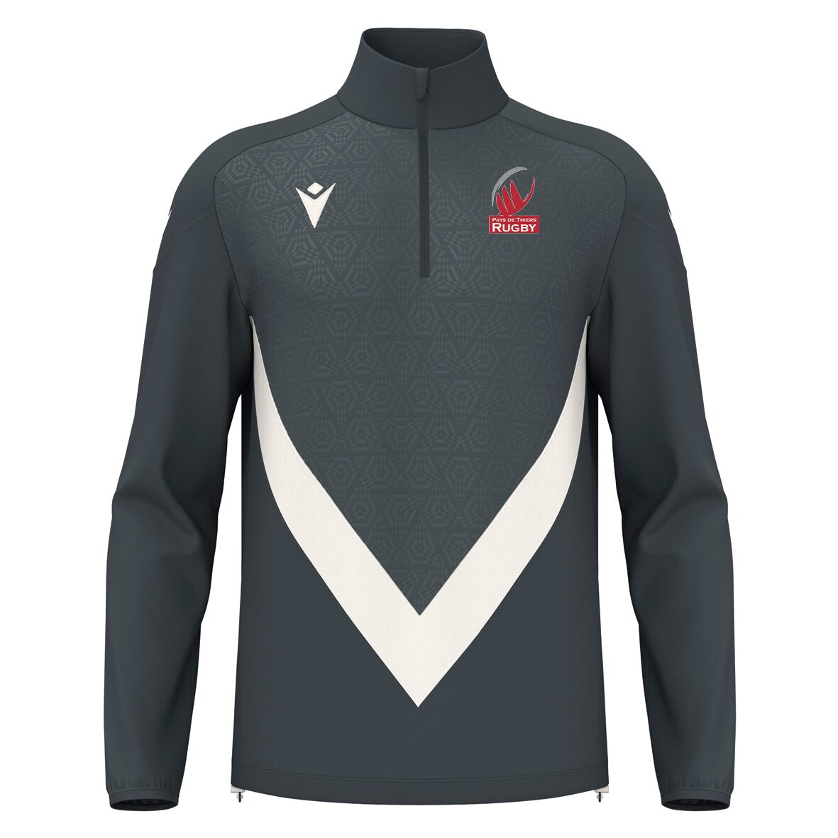 Top 1/4 zip conçu en tissu innovant Confortex, offrant un excellent équilibre entre confort et durabilité. Le design inclut une fermeture éclair inversée en nylon avec un curseur autobloquant, garantissant une manipulation sûre et facile lors de l’activité physique. Le col est conçu pour protéger le cou et retenir la chaleur, améliorant ainsi le confort pendant les entraînements en extérieur. Également caractérisé par un design embossé sur le devant, des poignets en Lycra et un ourlet réglable avec cordon.